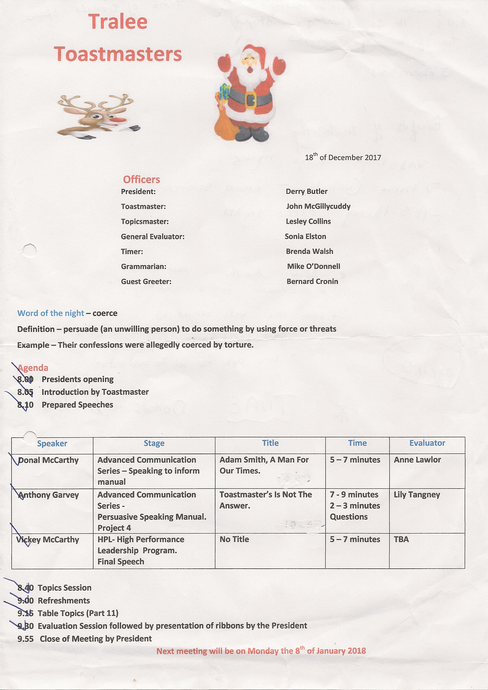 | January 18st | Club Meeting | Agenda |